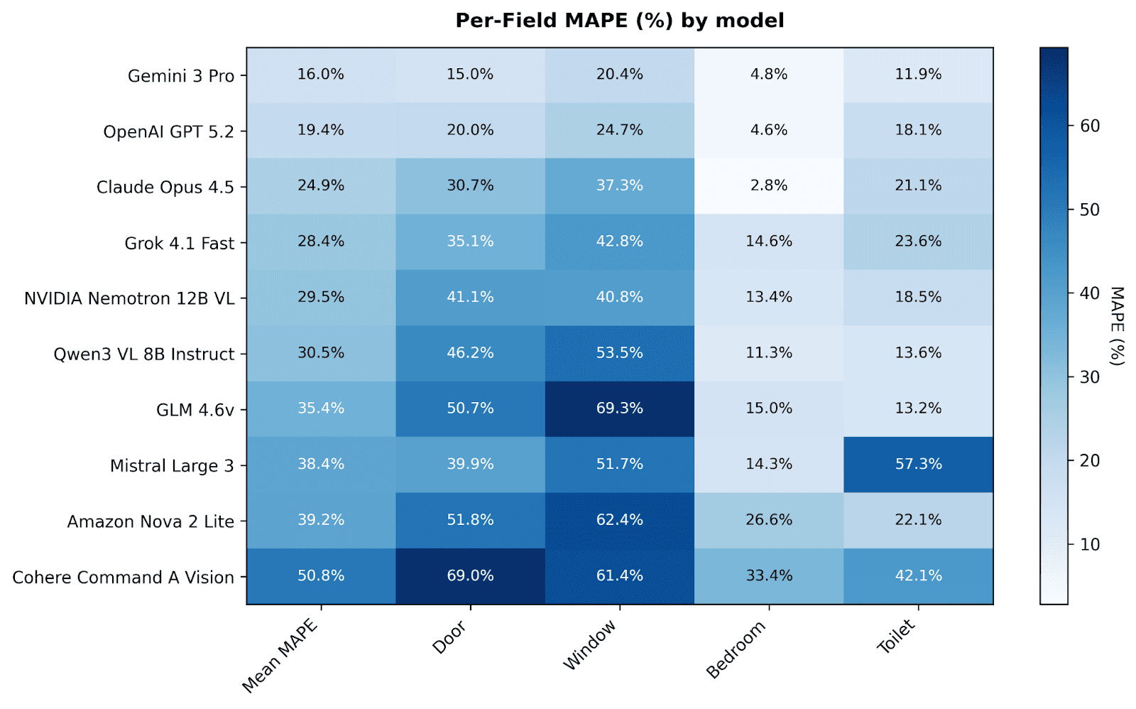 The error distribution also varies dramatically by element. Window counts show the highest error rates, sometimes exceeding 60-70% MAPE. Door counts hover around 15-30% for the best performers. This isn't just inaccuracy—at the high end, it's hallucination at a scale that makes output actively misleading rather than merely imprecise.