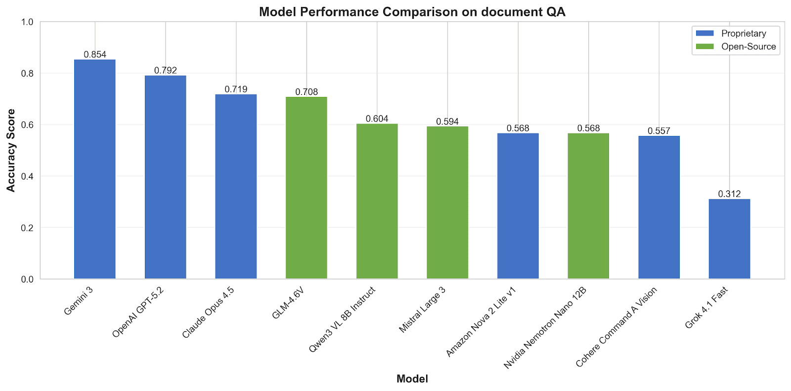 Document QA shows real promise: Top models reach 0.85 accuracy on drawing-grounded questions—but performance varies wildly by task type.