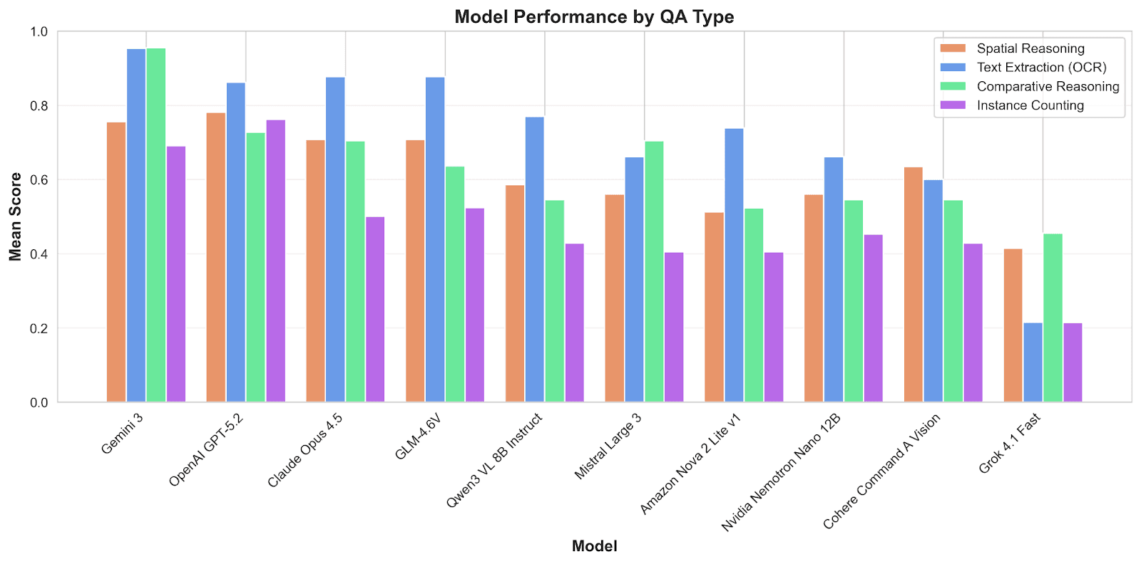 The capability gradient is clear and consistent: OCR/text extraction (~0.95 accuracy) > comparative reasoning (~0.80) > spatial reasoning (~0.70) > instance counting (~0.40-0.55)