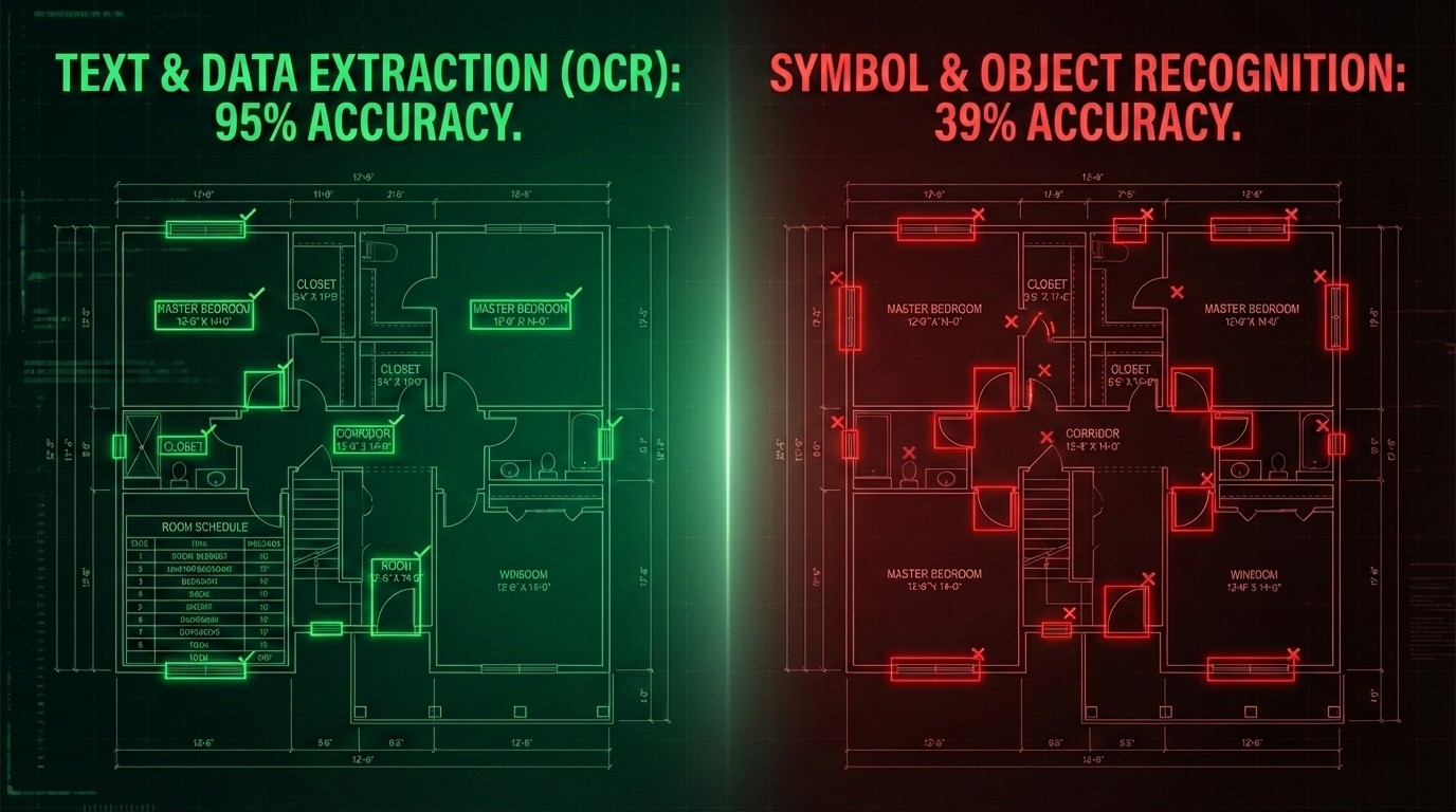 Current AI reads text exceptionally well. It interprets architectural symbols poorly. This distinction has profound implications for what we can and cannot automate.